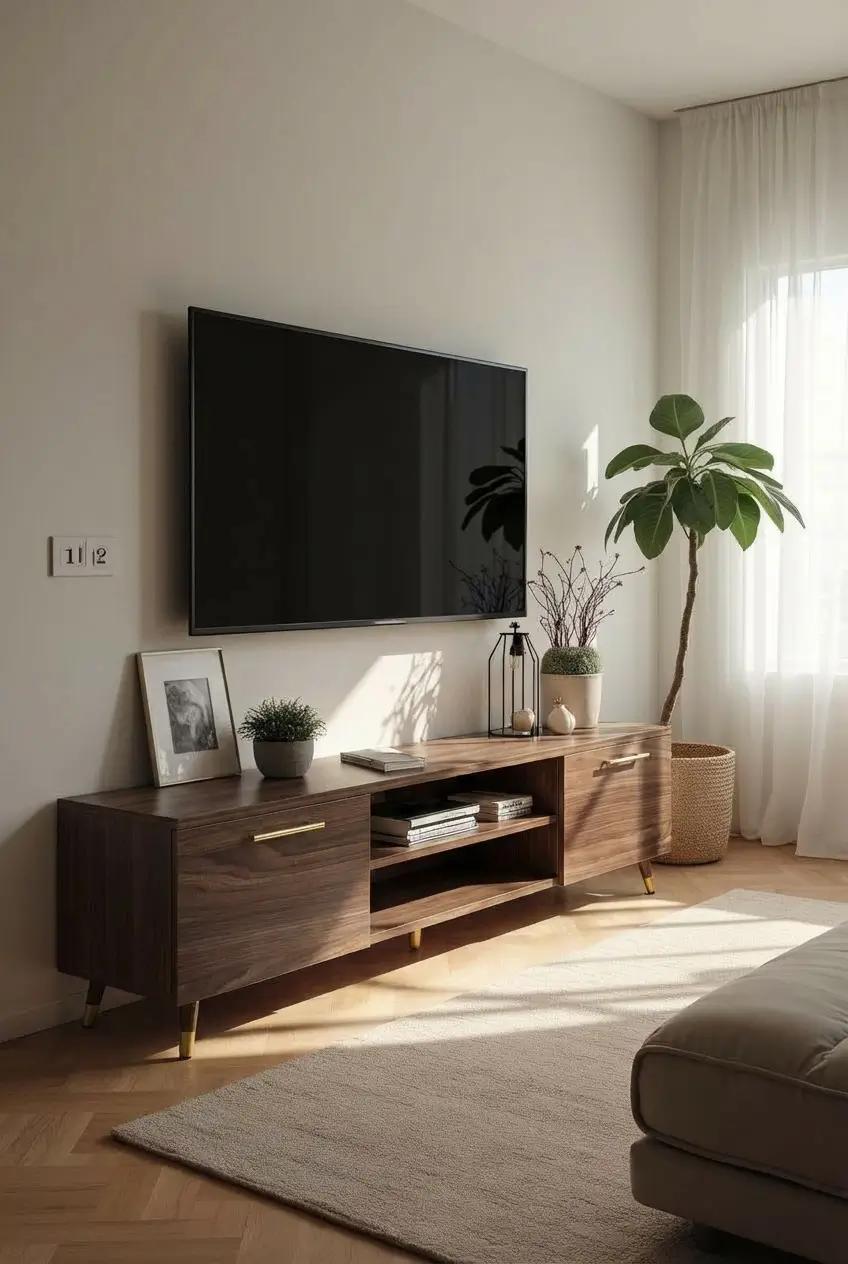 مساحة تخزين عملية: رفوف مفتوحة وأبواب لتخزين الأجهزة الإلكترونية والأغراض الأخرى بشكل مرتب.